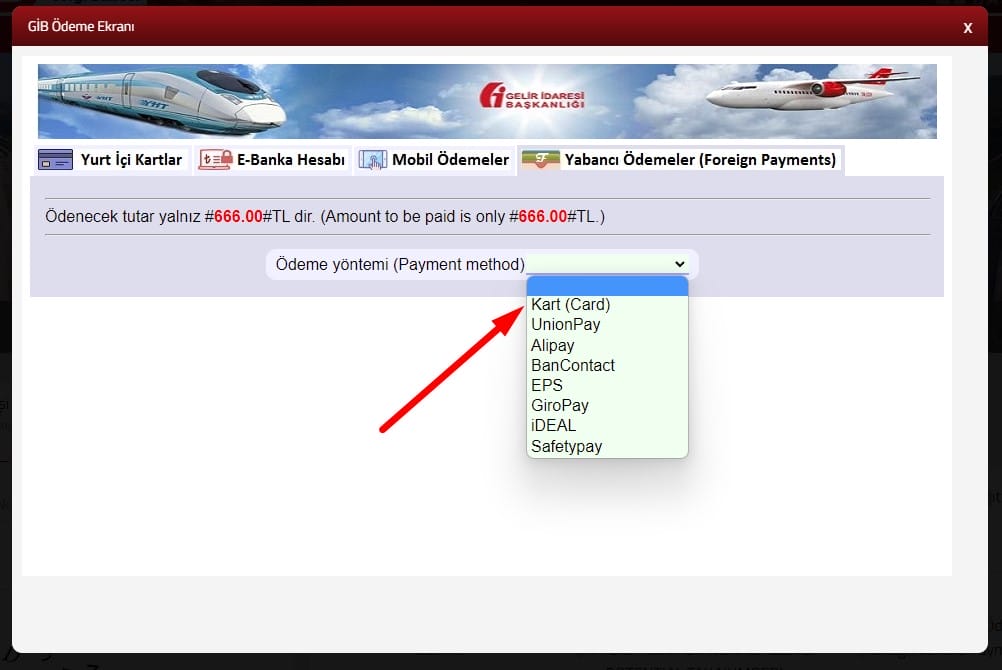 На следующей странице в выпадающем меню выберите пункт «Kart» (кредитная карта).