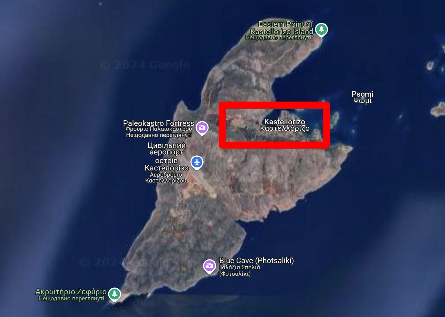 На Кастелоризоне живет меньше 600 человек. Остров имеет площадь 12 км2 и длину всего 6 км. Он может показаться не таким уж и маленьким островом для пешеходных прогулок. Однако, на самом деле, это не должно вас пугать. Населенная часть острова, которая нас интересует — это несколько кварталов в одной небольшой бухте (я выделил её красным прямоугольником на фото).